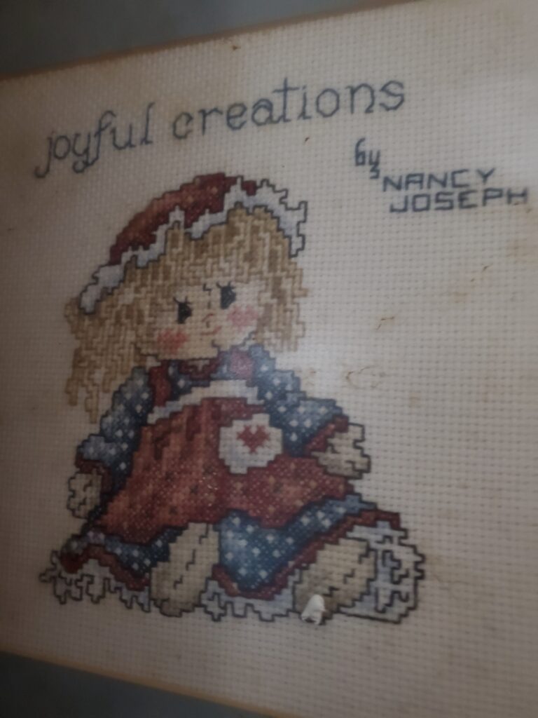 I made this cross-stitch piece for my doll business Joyful Creations (1990-2007). It’s currently hanging on the wall in the garage (our old craft studio).