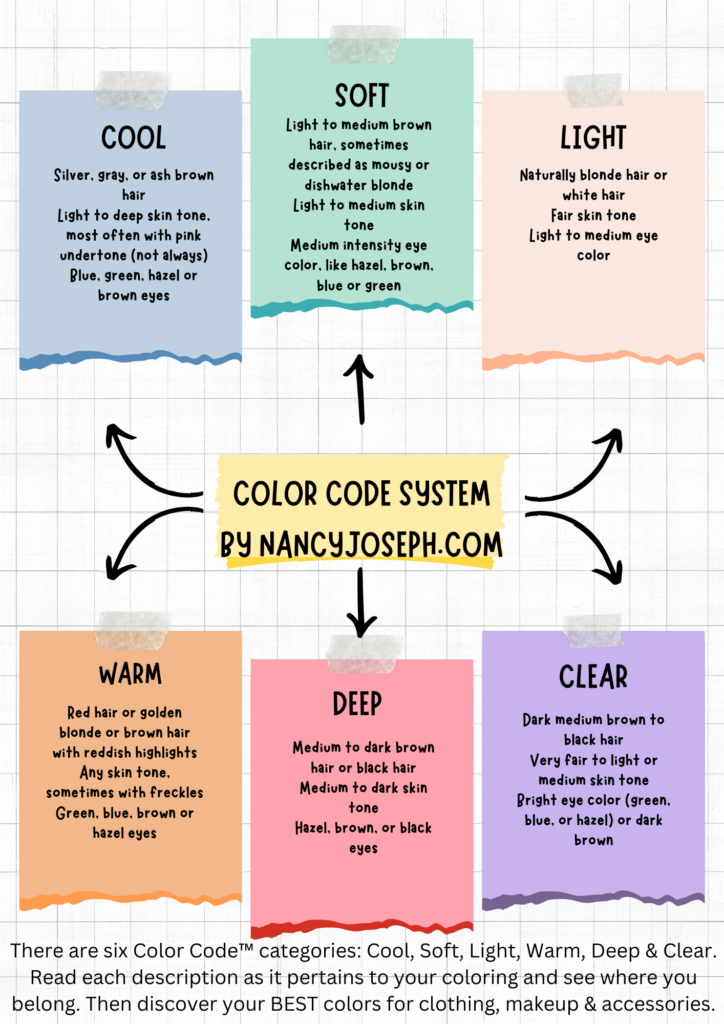 *RESULTS: When you take this FREE Color Quiz – Circle each description that pertains to you. Start with your HAIR. The Color Code with the MOST circles (three) will be your best COLOR CODE.